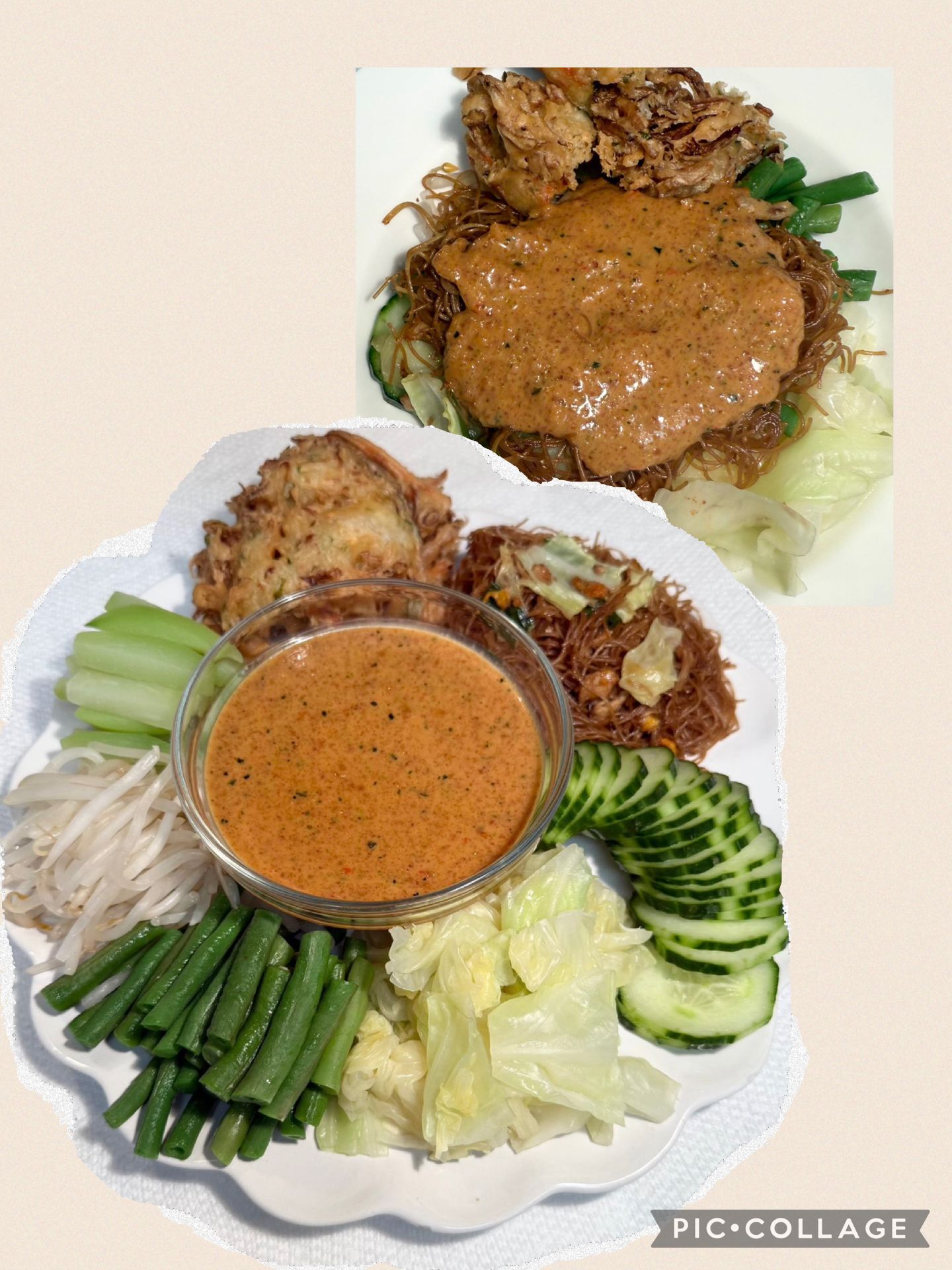 "description": "Variety of veggies, bakwan sayur, bihun goreng, tahu, kerupuk with Pecel Sauce",