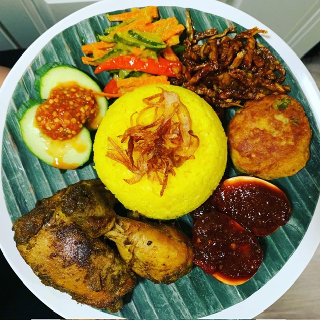 "description": "Yellow rice combination with fried chicken, balado egg, dried anchovy, turmeric pickles, potatoes fritter, cucumber and chili paste",
