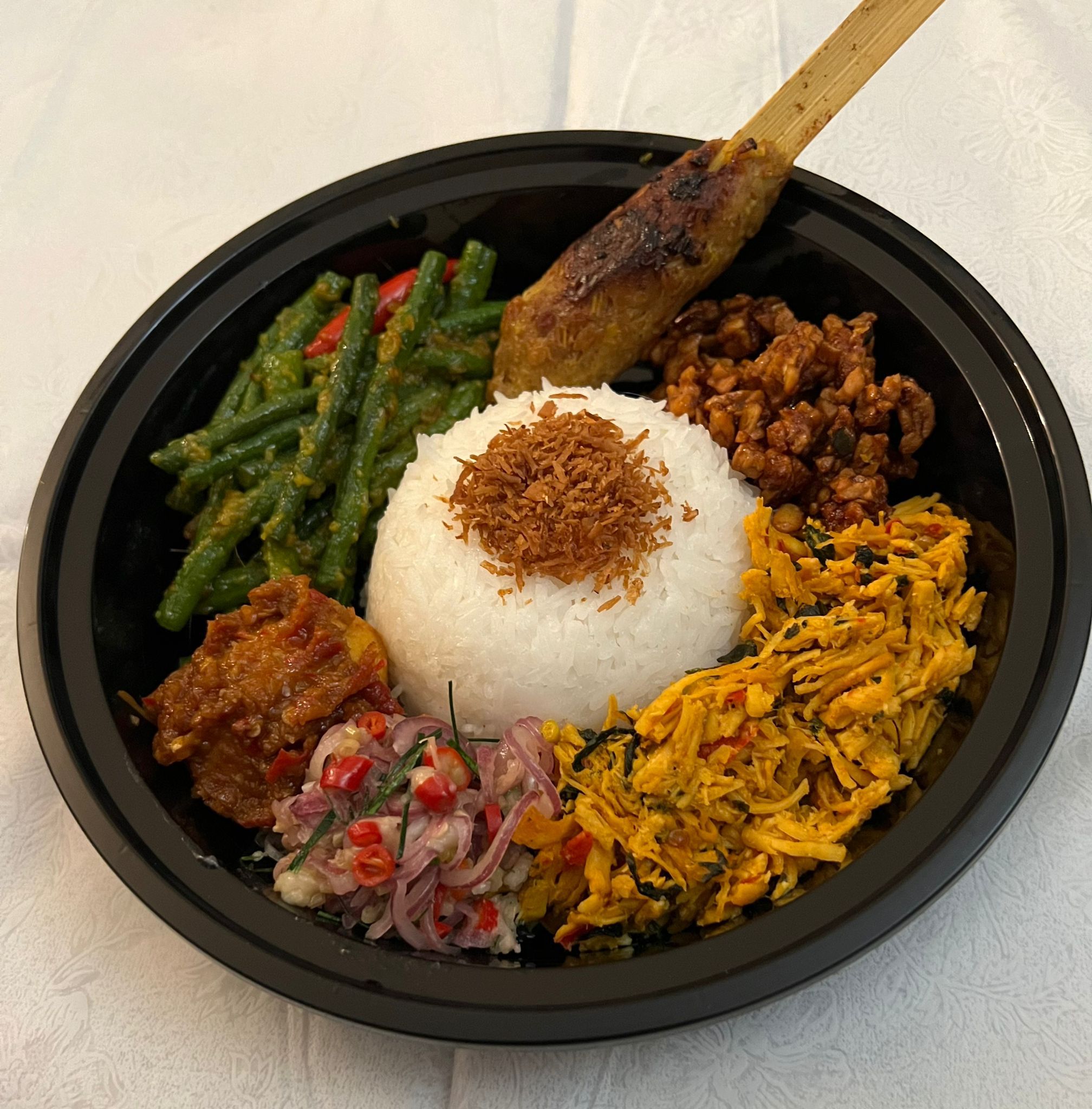 "description": "Indo Malay - Nasi Lauk Medan\n(Curry Chicken, Tauco Shrimp & tofu, Sambalado Gizzard & Petai & egg with green Serrano Chili)",