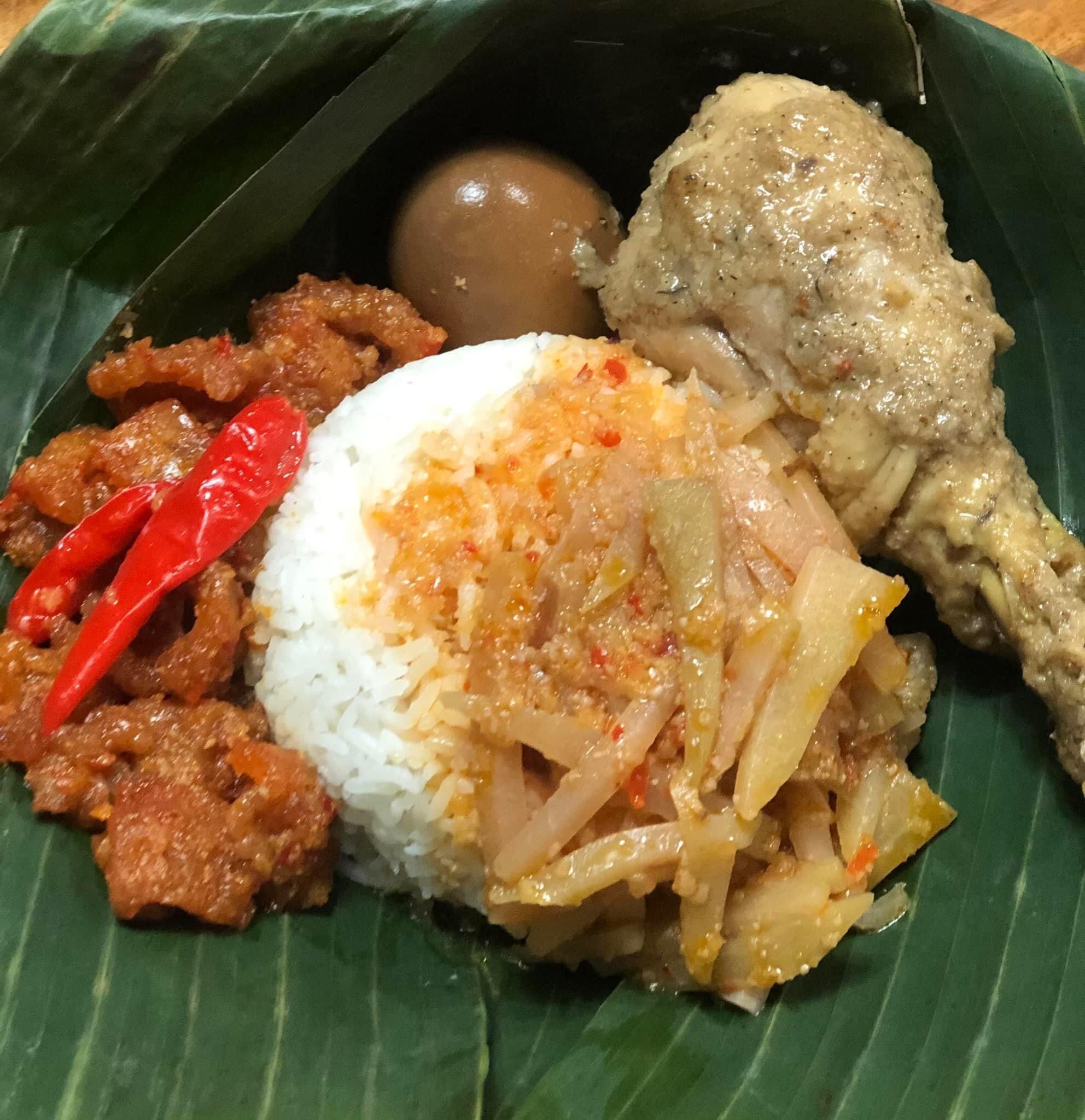 "description": "(White rice, beef rendang, spicy boiled egg, vegetable soup cooked w/coconut milk, eggplant, tofu, long bean in tauco, spicy potato w/anchovy and peanut, belacan)",
